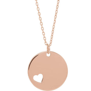 A simplistic yet elegant necklace design with a traditional or trendy style will give you a tailored look that goes from daytime wear to a night out on the town with ease. This polished disc with pierced heart necklace created from 14k rose gold engraving. The approximate pendant size is 15mm (9/16 inch) in width. The diamond-cut cable chain closes with a spring ring clasp, is 1mm in width and adjusts 16 to 18 inches in length. This is a made to order item and is estimated to ship in about 6-8 days. Please email service@theblackbow.com for more details.