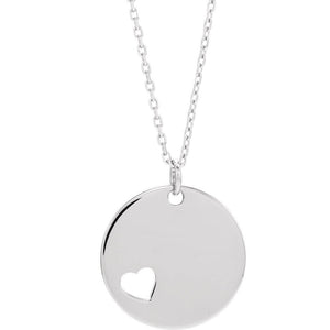 A simplistic yet elegant necklace design with a traditional or trendy style will give you a tailored look that goes from daytime wear to a night out on the town with ease. This polished disc with pierced heart necklace created from rhodium plated 14k white gold engraving. The approximate pendant size is 15mm (9/16 inch) in width. The diamond-cut cable chain closes with a spring ring clasp, is 1mm in width and adjusts 16 to 18 inches in length. This is a made to order item and is estimated to ship in about 6-8 days. Please email service@theblackbow.com for more details.