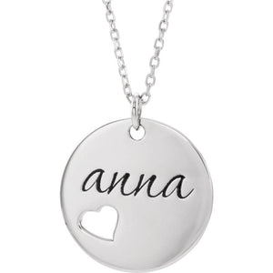 A simplistic yet elegant necklace design with a traditional or trendy style will give you a tailored look that goes from daytime wear to a night out on the town with ease. This polished disc with pierced heart necklace created from 14k yellow gold engraving. The approximate pendant size is 15mm (9/16 inch) in width. The diamond-cut cable chain closes with a spring ring clasp, is 1mm in width and adjusts 16 to 18 inches in length.