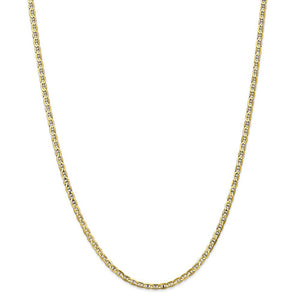 This polished anchor or mariner chain made of 10k yellow gold features a solid concave design that mimics the cable used to anchor boats with a vertical bar in the middle of each link. The 3mm width, 24-inch length makes a beautiful necklace for both men or women and is perfect paired with your favorite pendant or other chains for a layered look. Closes with a reliable lobster claw clasp.