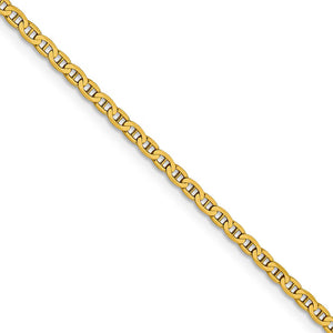 A nautical style design crafted to resemble the cable used to anchor ships, also known as the mariner chain, creates a simple innovative styled necklace. This 2.4mm width, 16-inch long, flat concave anchor link chain designed from 14k yellow gold is finished with a lobster claw clasp.