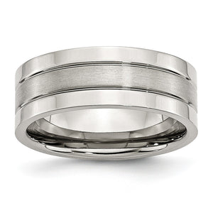 This wonderful, 8mm flat band features a grooved design with a satin center and polished edges that looks great day or night. The rounded inside fit will ensure long lasting comfort day in and day out. Available in whole and half sizes 6-13.