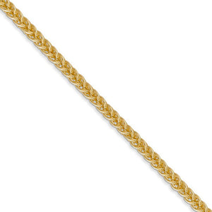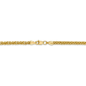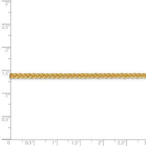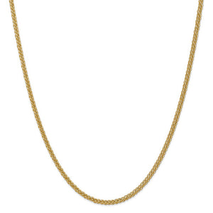 Strands of 14k yellow gold are braided and woven together to create a round wheat pattern for this 2.6mm width, hollow 3-wire link chain that closes with a lobster-claw clasp. Looks great alone, layered with multiple chains or pair it with a gold charm or pendant to complete your desired look. 18 inches in length.