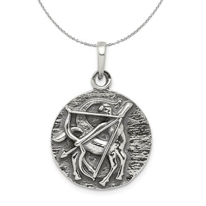 Sagittarius, the Archer. The Centaur, teacher of wisdom, rides through the sky with his bow, arrow, and quiver. This 19mm (3/4 Inch) antiqued sterling silver disc features a textured raised relief design with the word Sagittarius inscribed on the back and dangles from a tapered bail that will accommodate up to a 4mm width chain. Includes a 20 Inch, 1.25mm sterling silver cable chain with a lobster clasp closure.