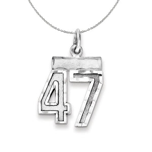 Celebrate your favorite sports player, lucky number or milestone date in your life with a prominent rhodium-plated sterling silver charm. Each satin and diamond cut number is approximately 12mm (7/16 Inch) in length, which is finished with a 3mm top bar and classic jump ring that will accommodate up to a 3mm chain. Includes a 1.25mm, 20 inch sterling silver cable chain.