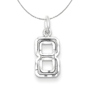 Celebrate your favorite sports player, lucky number or milestone date in your life with a prominent rhodium-plated sterling silver charm. This satin and diamond cut number is approximately 12mm (7/16 Inch) in length and is finished with a classic jump ring that will accommodate up to a 3mm chain. Includes a 1.25mm, 18 inch sterling silver cable chain.