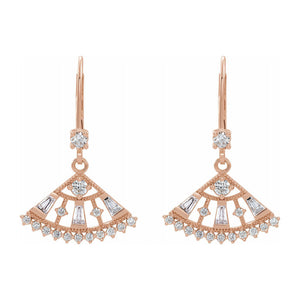 This vintage-inspired 14k rose gold design has an old-fashioned elegance that never goes out of style. The 18 x 13mm fan dangle features an open motif with milgrain details and 36 sparkling white diamonds. Hanging length is approximately 28mm (1 1/8 inch). Each round diamond is I1 in clarity and G-H in color. Each tapered baguette diamond is SI2-SI3 in clarity and G-I in color. Total diamond weight for the pair is 3/4 of a carat. Diamond treatment: natural, not enhanced. This is a made to order item and is estimated to ship in about 6-8 days. Please email service@theblackbow.com for more details.