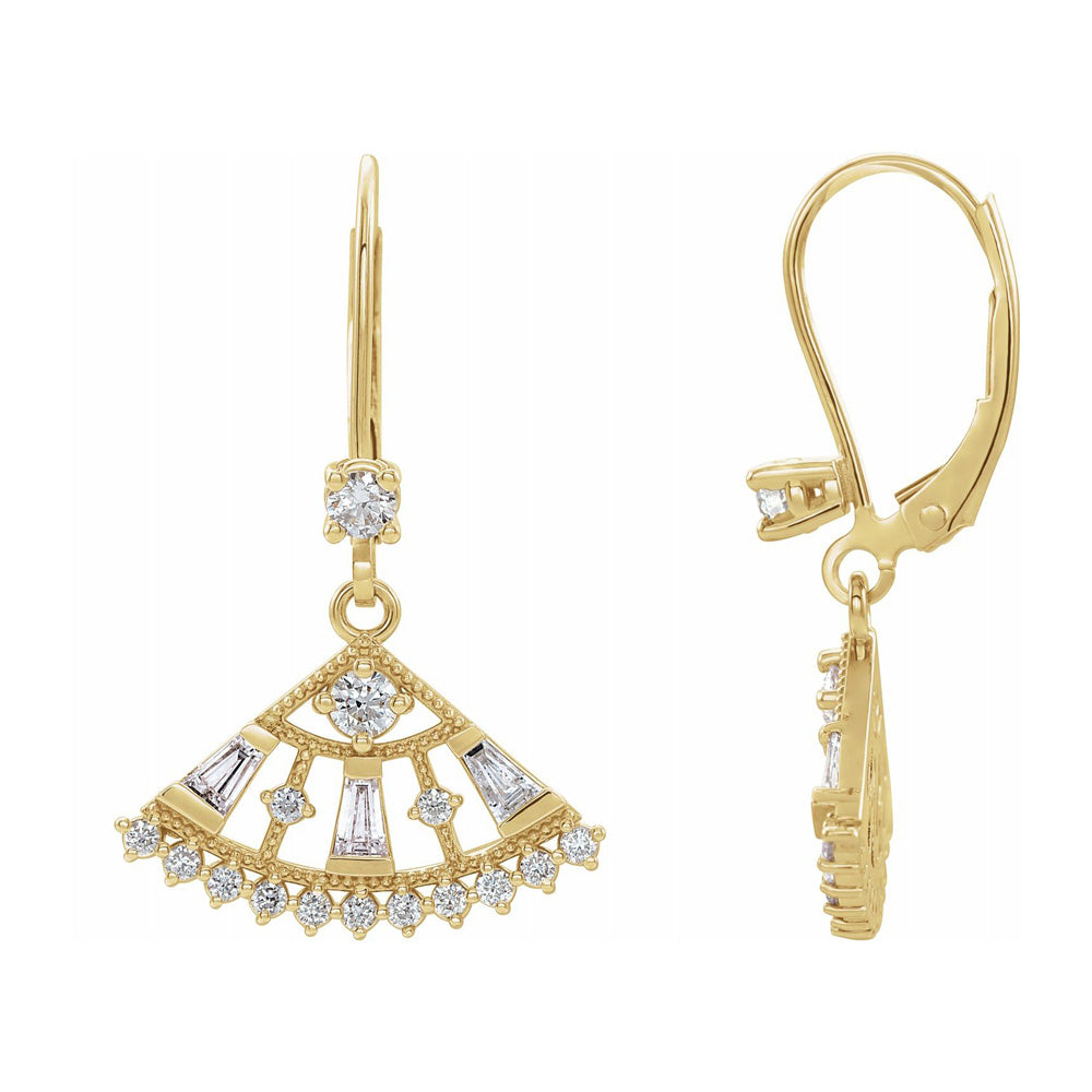 • This vintage-inspired 14k yellow gold design has an old-fashioned elegance that never goes out of style. The 18 x 13mm fan dangle features an open motif with milgrain details and 36 sparkling white diamonds. Hanging length is approximately 28mm (1 1/8 inch). Each round diamond is I1 in clarity and G-H in color. Each tapered baguette diamond is SI2-SI3 in clarity and G-I in color. Total diamond weight for the pair is 3/4 of a carat. Diamond treatment: natural, not enhanced. This is a made to order item and is estimated to ship in about 6-8 days. Please email service@theblackbow.com for more details.