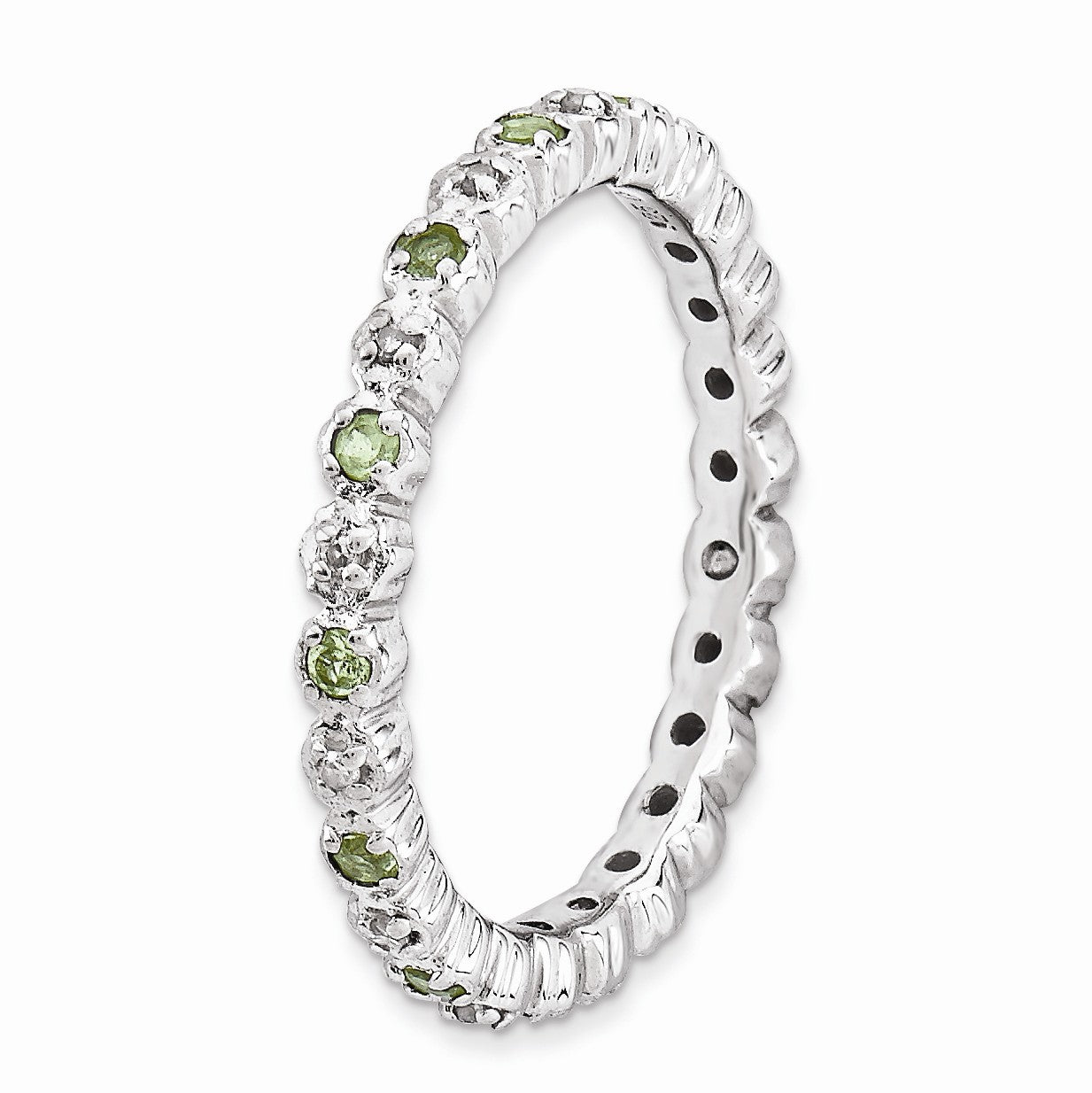 Peridot, August's birthstone is known to bring wealth and prosperity; it also symbolizes friendliness, purity and simplicity. Diamonds of course are said to be a girl's best friend. This 2.5mm wide band fashioned from rhodium plated sterling silver is prong set with alternating genuine gemstones all the way around. Guaranteed to fit together perfectly with all of the mix and match Stackable Expressions rings. Gemstone and diamond treatment: natural, not enhanced.