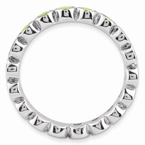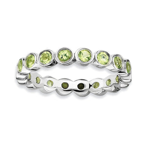 Peridot, August's birthstone is known to bring wealth and prosperity; it also symbolizes friendliness, purity and simplicity. This 3. Mm wide band fashioned from rhodium plated sterling silver is bezel set with 2. Mm round faceted natural gemstones all the way around. Guaranteed to fit together perfectly with all of the mix and match Stackable Expressions rings.