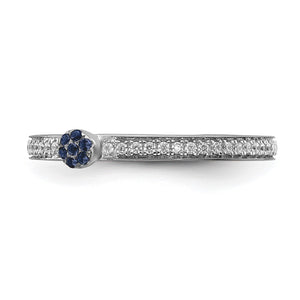 Make it simple and stylish with bands of different textures, finishes, widths and colors or extravagant with diamonds and gemstones! This stackable ring created from rhodium-plated 14k white gold features 7 lab created-sapphires totaling .4 of a carat and 24 genuine diamonds totaling 1/8 carat. The natural diamonds are I2 in clarity and I-J in color. The color range varies on all lab-created gemstones so please allow for slight variations in shades (medium navy to royal blue). The color on your screen may also not reflect actual gemstone color due to variations in monitors. The approximate band width is 2mm and the top head width is 3mm. Guaranteed to fit together perfectly with all of the mix and match Stackable Expressions rings.