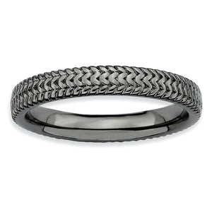 • Make it simple and stylish with bands of different textures, finished, widths and colors! This black ruthenium-plated sterling silver band features a textured design with a high polished finish that measures 3.5mm wide. Guaranteed to fit together perfectly with all of the mix and match Stackable Expressions rings.