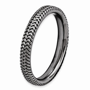 Make it simple and stylish with bands of different textures, finished, widths and colors! This black ruthenium-plated sterling silver band features a textured design with a high polished finish that measures 3.5mm wide. Guaranteed to fit together perfectly with all of the mix and match Stackable Expressions rings.