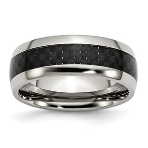 The bold sleek styling of this polished stainless steel ring features a center stripe of black carbon fiber inlaid on a domed 8mm band with a comfort fit interior.