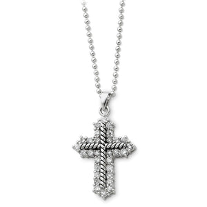 This jeweled rope cross is crafted from rhodium plated sterling silver then outlined with 30 cubic zirconia stones. The pendant is approximately 25mm (1 inch) in width by 42mm (1 5/8 inch) in length with the bail. The bead chain is 2mm in width, 18-inches in length and closes with a spring ring clasp. Each necklace includes a card with the following quote from scripture printed in English and Spanish. Set your hearts on things above, where Christ is seated at the right hand of God, set your mind on things above, not on earthly things. - Colossians 3:1-2