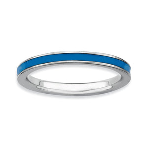 Create the perfect stack with enameled bands available in 10 vibrant colors. Featuring a center stripe of blue enamel this 2.5mm sterling silver band is finished with tarnish resistant rhodium plating so it will retain its bright white finish. Guaranteed to fit together perfectly with all of the mix and match Stackable Expressions rings.