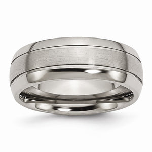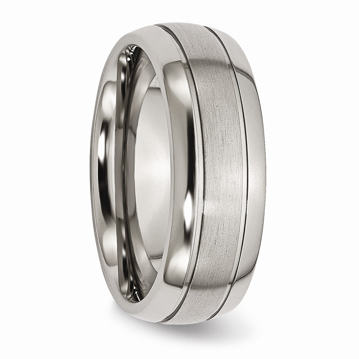 Our sophisticated, 8mm domed band features a double grooved design with a brushed center and polished edges that looks great on both men and women. The rounded inside fit will ensure long lasting comfort day in and day out. Available in whole and half sizes 7-14.