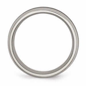The bold sleek styling of this polished titanium ring features a center stripe of black carbon fiber inlaid on a classic domed band. It measures 8mm wide and has a comfort fit interior design.