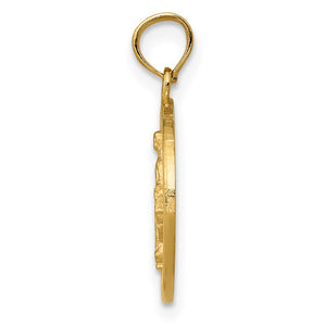 Celebrate and honor all special occasions with jewelry of religious significance! Our collection of spiritually inspired designs that show faith, hope and devotion are perfect for commemorating life's milestones. This small round Miraculous medal pendant crafted in 14k yellow gold features a solid, 2-sided, polished and satin design. The approximate size is 13mm (1/2 inch) in width by 19mm (3/4 inch) in length with the bail. This item does not include a chain.