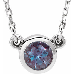 Delicate and dainty, this simple yet stylish necklace will make a big impression. It features a 4mm faceted lab-created alexandrite bezel set in rhodium-plated 14k white gold. The round pendant is attached to 1mm width, diamond-cut cable chain finished with a spring ring clasp and is 16 inches in length. The color range varies on all gemstones so please allow for slight variations in shades. The color on your screen may also not reflect actual gemstone color due to variations in monitors. This is a made to order item and is estimated to ship in about 10 days. Please email service@theblackbow.com for more details.