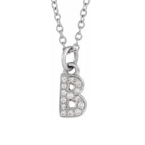 Flash your initials in sparkly style with a petite diamond letter necklace. Rendered in rhodium-plated 14k white gold and includes an adjustable 16 to 18-inch long, 1mm width solid cable chain that closes with a spring ring clasp. The tiny letter B is pave set with 14 round, I1 clarity, G-H color, genuine diamonds totaling 1/20 carat and is approximately 4.25mm in width by 6.25mm (1/4 inch) in length. This is a made to order item and is estimated to ship in about 6-8 days. Please email service@theblackbow.com for more details.
