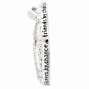 Twin hearts prong set with cubic zirconia stones are framed in rhodium-plated sterling silver to create a lovely 3/4 inches pendant that is inscribed on the side with antiqued lettering that reads, Sisters by chance, friends by choice. Each necklace includes an 18 inch cable chain and a card with the following poem written by the artist printed in English and Spanish. SISTERS BY CHANCE, FRIENDS BY CHOICE - We are sisters by chance but by choice we are friends. We are there for each other from beginning to the end. I treasure our friendship for you are always there, through my highs and lows, showing how much you care. Thank you for who you are. A strong relationship we've grown. Not only are you my sister, but the best friend I have known.