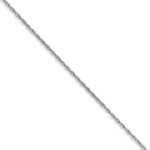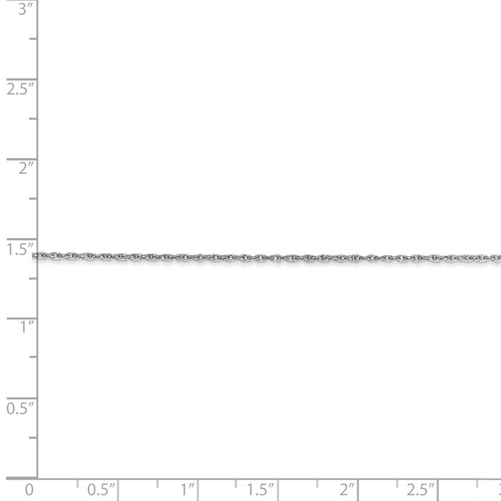 Lightweight and supple, a baby rope chain featuring an open link design of rhodium-plated 10k white gold will highlight your favorite charm or pendant to perfection. Beautifully crafted with a bright polished finish, this delicate .80mm chain closes with a spring ring clasp for a worry free fit. 18 inches in length.