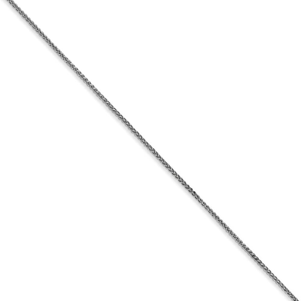 Interwoven figure eight links of polished rhodium-plated 14k white gold form a distinctive, braided design that will add elegance and beauty to your ensemble. This thin 0.8mm wide, solid link spiga chain closes securely with a spring ring clasp. 16 inches in length.