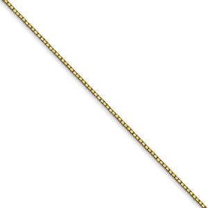 Known for its strength and flexibility, this thin delicate box chain features a simple design that is less likely to kink and a polished finish that catches the light with every movement. It measures .90mm in width by 24-inches in length and is fashioned from 10k yellow gold with a classic lobster-claw clasp.