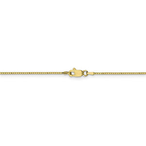 Known for its strength and flexibility, this thin delicate box chain features a simple design that is less likely to kink and a polished finish that catches the light with every movement. It measures .90mm in width by 20-inches in length and is fashioned from 10k yellow gold with a classic lobster-claw clasp.