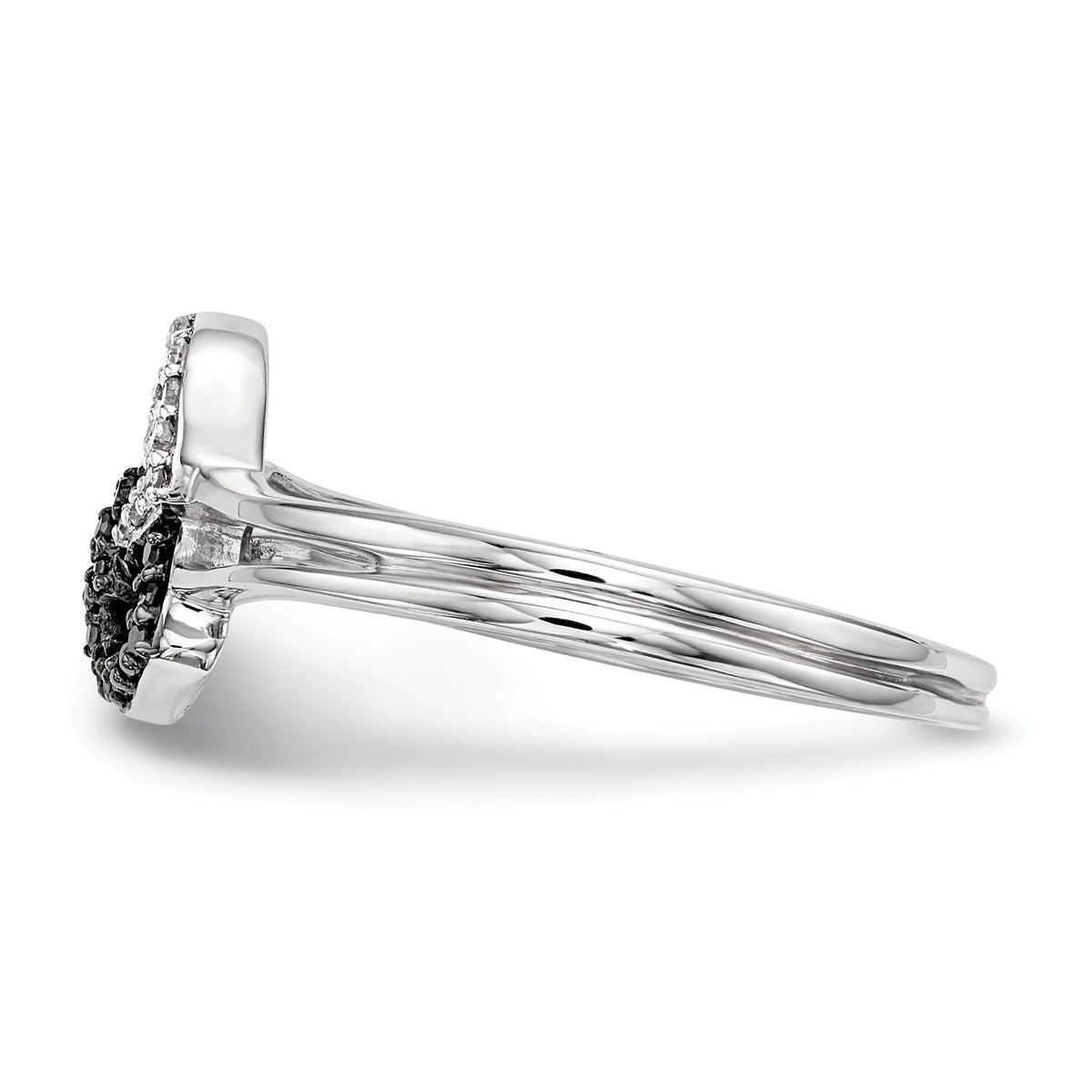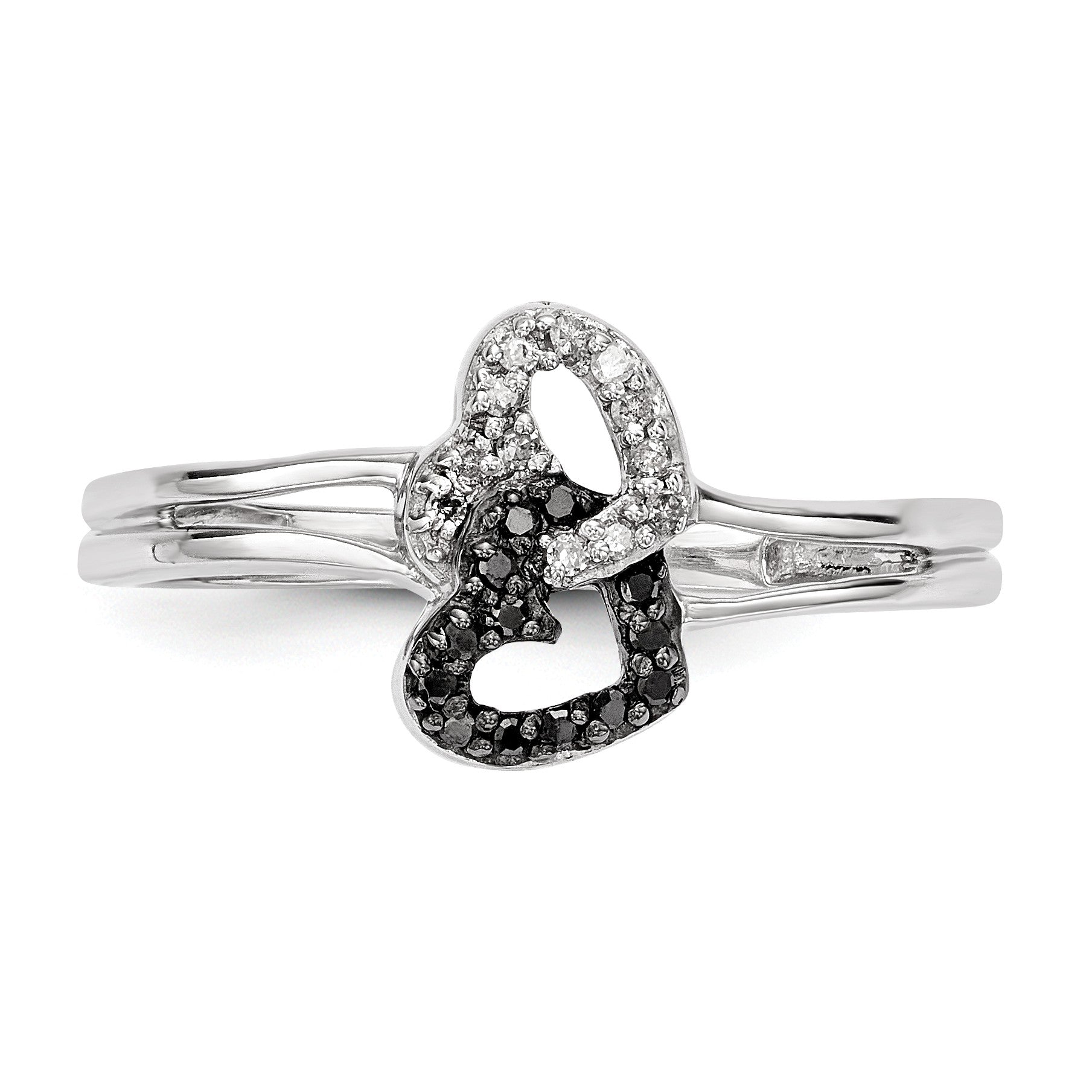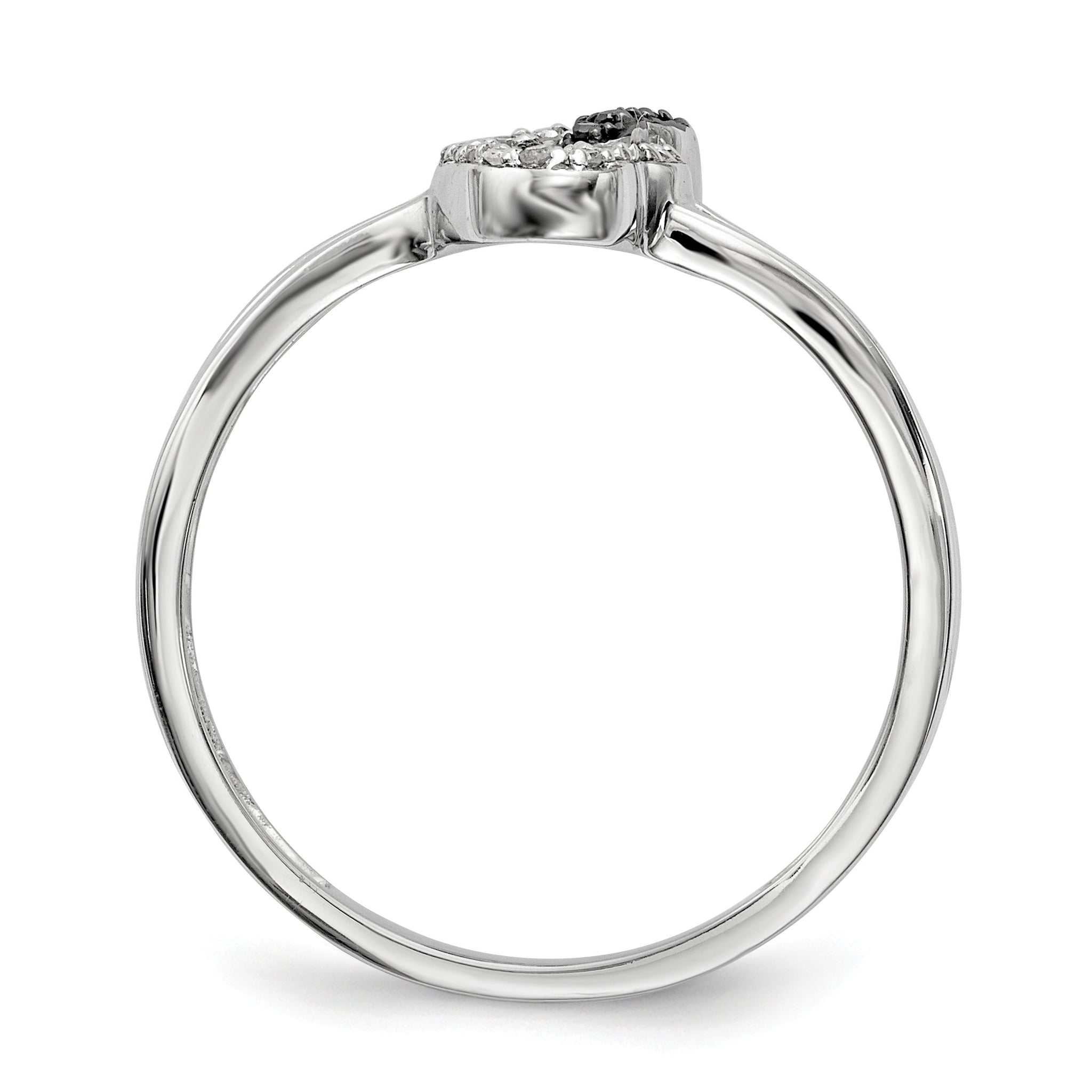Opposites do attract! Like the sparkle of the stars in the dark night sky, this black and white diamond sideways heart ring matches that beauty. Designed from tarnish resistant rhodium sterling silver and prong set with H-I natural white and black heat-treated, I2-I3 clarity diamonds totaling 1/10 carat. It features a split shank, tapered fit that is approximately 11mm (7/16 inch) in width across the top and 2mm in width at the bottom. Available in whole sizes 6-8 only.