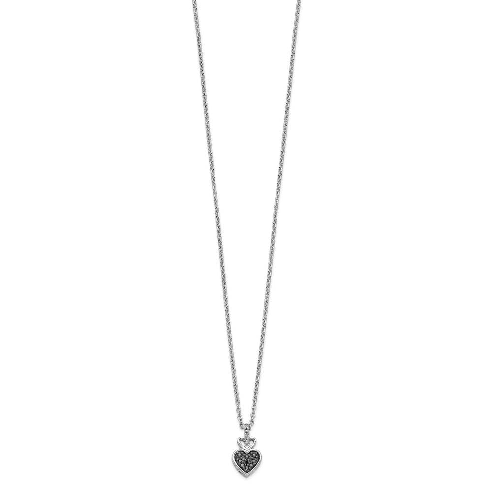 Opposites do attract! Like the sparkle of the stars in the dark night sky, this black and white diamond double heart necklace matches that beauty. It is designed from tarnish resistant rhodium plated sterling silver and prong set with H-I natural white and black heat-treated, I2-I3 clarity diamonds totaling 1/20 carat. The small pendant is approximately 9mm (3/8 inch) in width by 15mm (9/16 inch) in length, which includes the bail. The 1mm cable chain is finished with a lobster clasp and 2-inch extension that makes it adjustable from 18 to 20 inches in length.