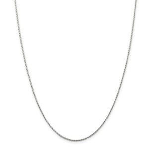 This solid link, 1.25mm width by 16-inch long, round Parisian style wheat chain is made from polished rhodium-plated 14k white gold and closes with a lobster claw clasp. Made in the U.S.A.