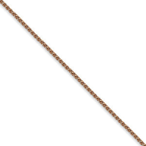 Solid polished links of 14k rose gold are plaited together to create a strong spiga (wheat) design for this 1.2mm width, 16-inch long necklace chain that closes with a lobster claw clasp. While this style is not as flexible or liquid-like as some other styles, it will complement your favorite charm or pendant to perfection with its intricate style.