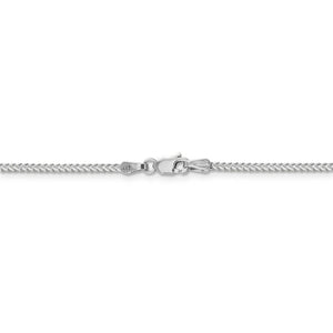 • Fashioned from solid 14k white gold, this stunning Franco chain with its flexible and resilient design is the perfect choice for when you want to make a soft feminine statement. Measuring 1.3mm in width, this polished chain closes securely with a lobster-claw clasp. 8 inches in length.