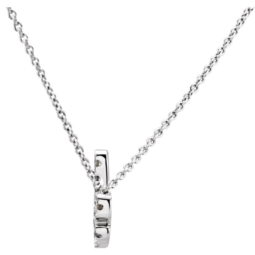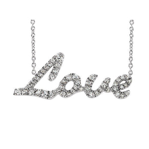 A timeless classic design fashioned from 14k white gold featuring forty-nine genuine diamonds totaling 1/5 carat and an 18-inch collar length. The love script pendant is approximately 10mm (3/8 inch) in length by 25mm (1 inch) in width and the attached 1mm solid rolo chain is finished with a spring ring clasp. Each natural round diamond is I1 in clarity and H-I in color.