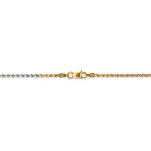 This stunning rope chain handmade from solid 14k yellow, white and rose gold features a sparkling, diamond-cut design that is finished with a secure, lobster clasp. It measures 1.5mm in width and looks great alone or layered with multiple chains. 7 inches in length.