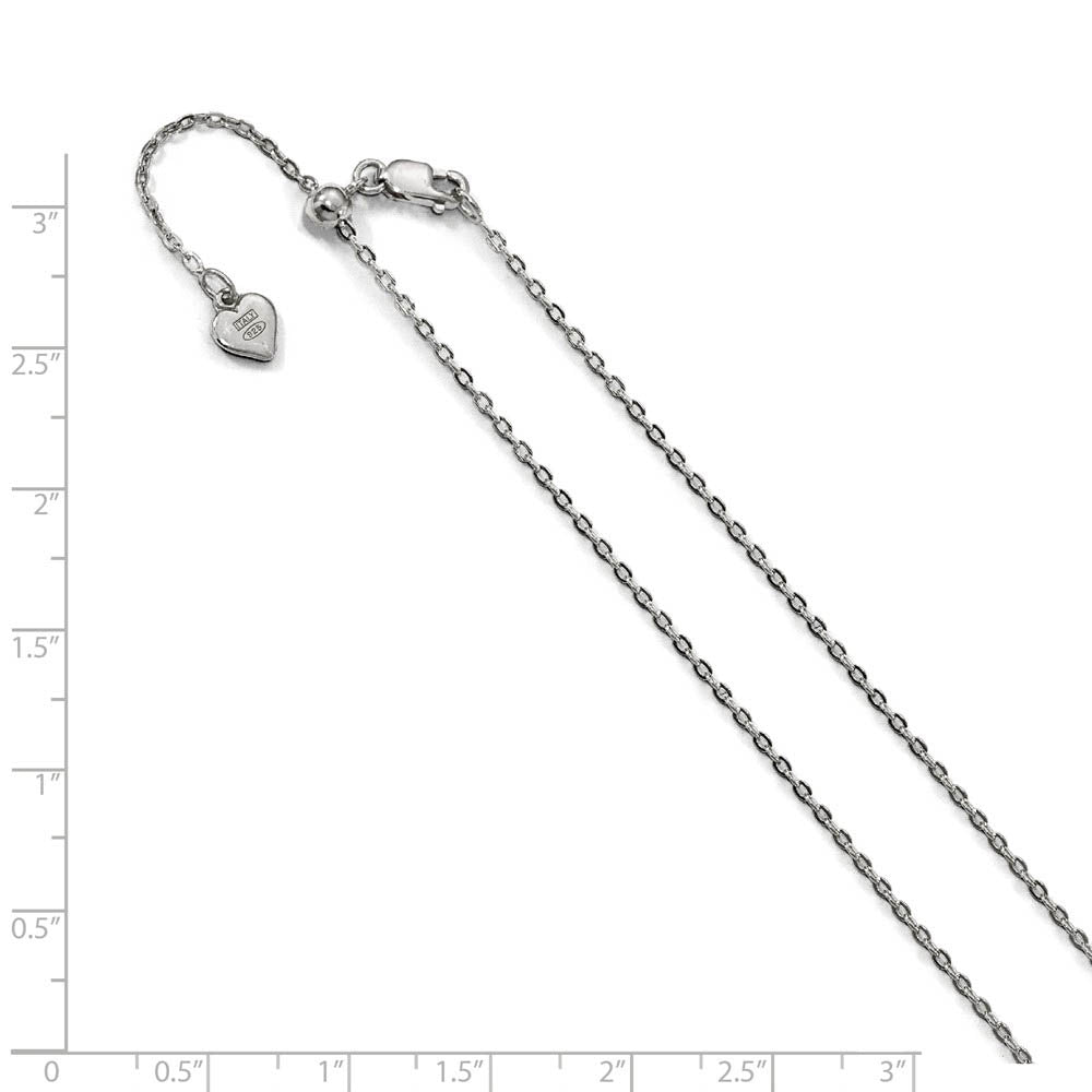 Oval links of rhodium plated sterling silver interlock with an alternating pattern to create a classic cable design that never goes out of style. This polished necklace chain is 1.5mm in width and features a slide mechanism with a lobster clasp that adjusts to any length up to 22 inches. Made in Italy.