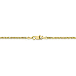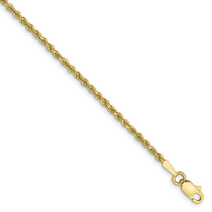 • Spiraling rope chains made of 10k yellow gold enhanced with diamond-cuts are extremely popular because they offer a classic design with maximum shine. Flexible and strong, this solid link, anklet chain measures 1.75mm in width by 10-inches in length and closes with a lobster-claw clasp.