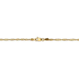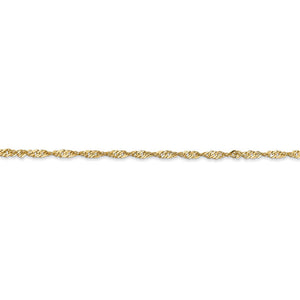 Twisting links of 14k yellow gold form a distinctive feminine design that will add unexpected shimmer to your ensemble. This 1.7mm Singapore chain features a solid link construction and a bright, polished finish to give it a radiant glow. It closes with an easy to use lobster-claw clasp to provide a secure, worry-free fit. 8 inches in length.