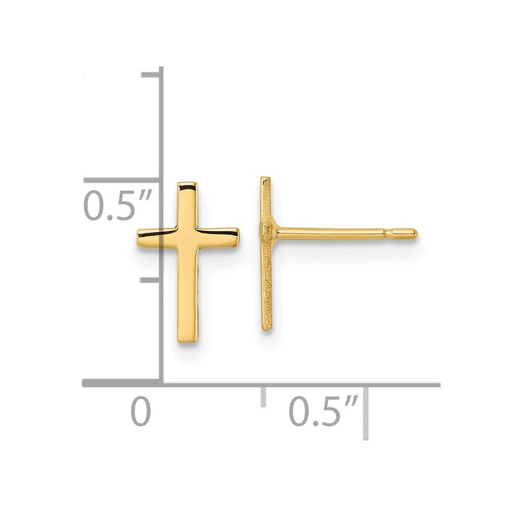 Simple elegance perfect for all ages, polished crosses fashioned from 14k yellow gold finished with a friction back post. Approximate size is 7mm (1/4 inch) in width by 10mm (3/8 inch) in length. Made in the U.S.A. This item is backordered and we estimate it to ship in approx. 10-12 days. Please email service@theblackbow.com for more details.