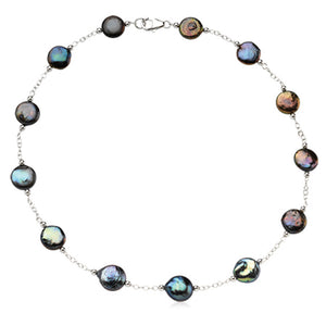Shimmering freshwater cultured dyed black coin pearls set in sterling silver. Pearls measure 12-13mm, necklace measures 18 inches in length including the fancy lobster clasp. Due to the nature of pearls, please allow for slight variations in color.