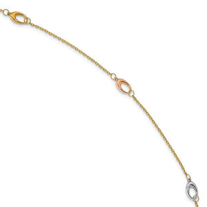 14k Tri-Color Gold Cable Chain And Oval Station Anklet, 9.5-10.5 Inch