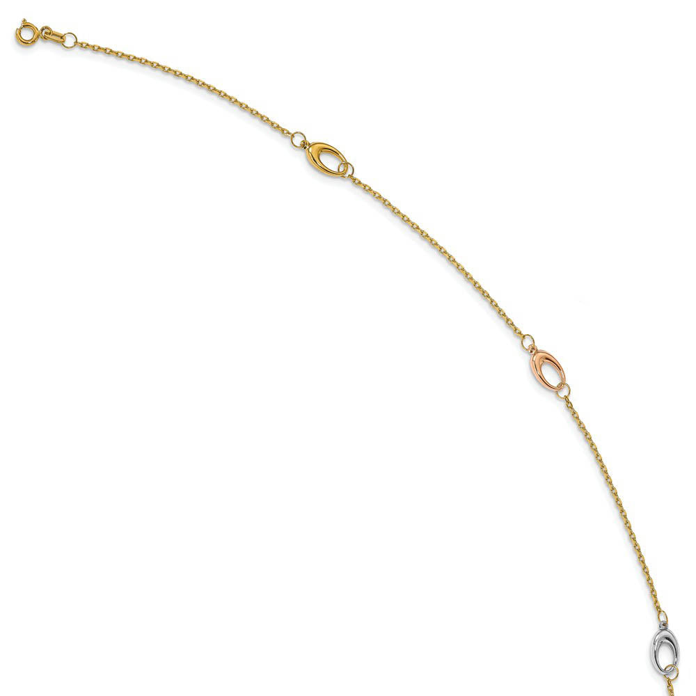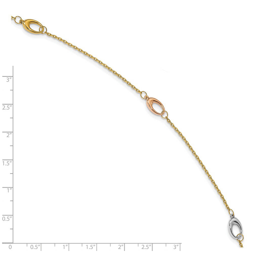 Indulge in a little bling for your leg with a shiny 14k tri-color gold anklet featuring three 5 x 11mm (3/16 x 7/16 inch) hollow oval link stationed on a 1.5mm cable chain. It is adjustable 9.5 to 10.5 inches in length and closes with a spring ring clasp.