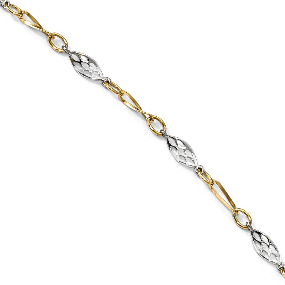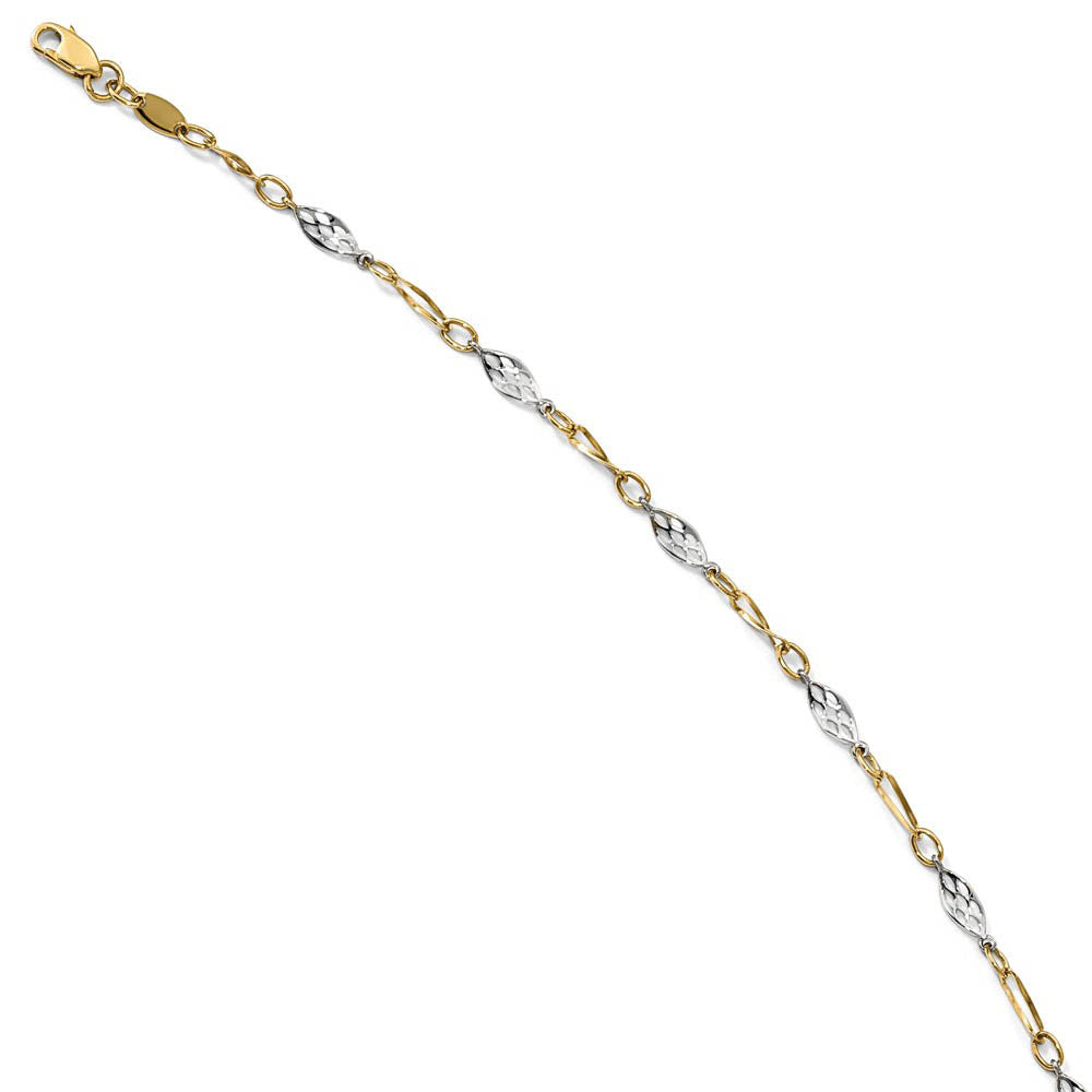 Indulge in a little bling for your leg with a shiny 14k two tone gold anklet featuring a twisted link design. It is approximately 3mm in width, adjustable in length from 9 to 10 inches and closes with a lobster claw clasp.