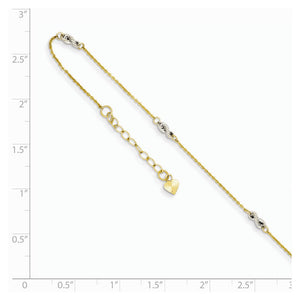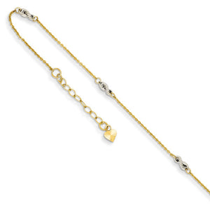 Make a soft feminine statement with this 14k two-tone gold bracelet that adds unexpected shimmer around your ankle. Measuring 9 inches in length, this dainty 1mm cable chain accented with 3mm white gold rope chain stations includes a 1-inch extender and spring ring clasp.
