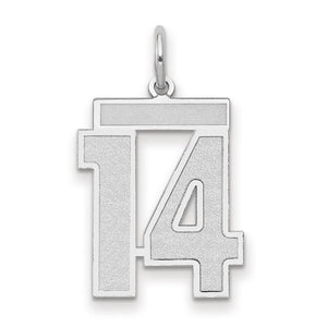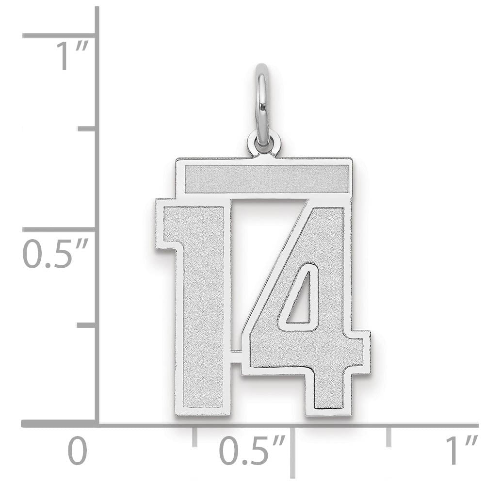 Celebrate your favorite sports player, lucky number or milestone date in your life with a prominent 14 white gold charm. Each laser-cut satin and polished number is approximately 14mm (9/16 inch) in length, which is finished with a 3mm top bar and classic jump ring that will accommodate up to a 3mm chain. Made in the U.S.A. Chain not included.
