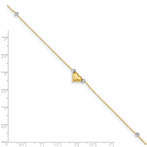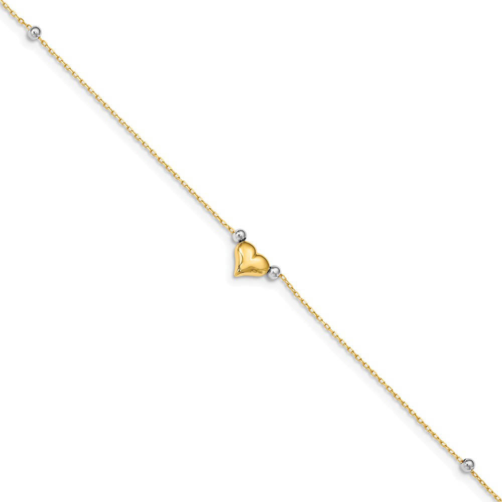 14k Yellow and White Gold Puffed Heart and Bead Anklet, 10 Inch