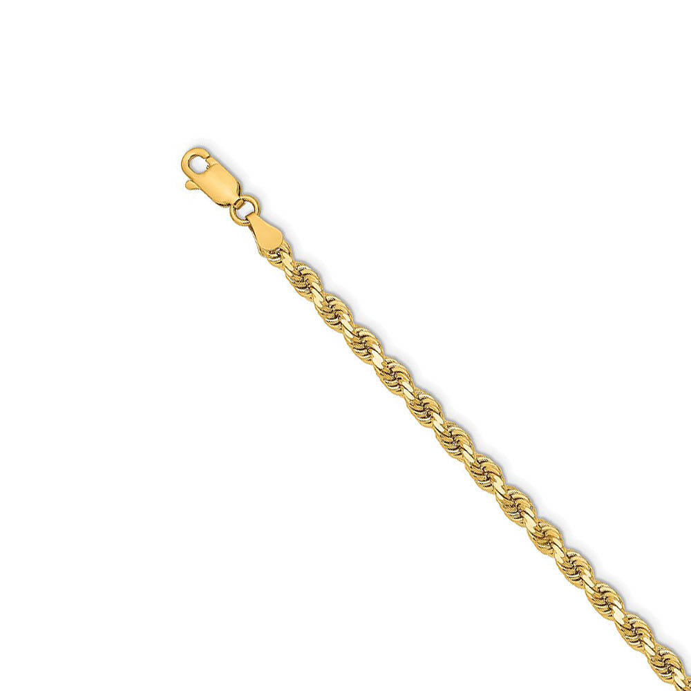 • Rope chain necklaces made of twisted 14k yellow gold strands enhanced with diamond-cuts are extremely popular because they offer a classy design with maximum shine. Flexible and strong, this elegant chain measures 3.25mm in width by 30-inches in length and features a solid link construction with an easy to use lobster claw clasp.