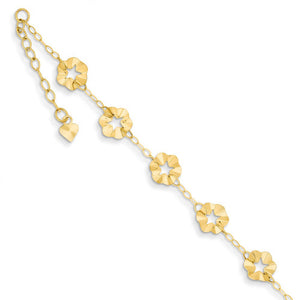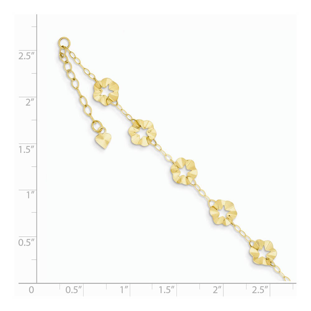This 9-inch anklet is crafted with 14 karat yellow gold and features 7.5mm flower station charms and 1-inch extender accent with a tiny heart charm. It closes with a spring ring clasp.